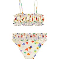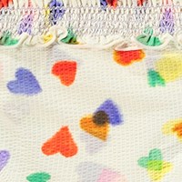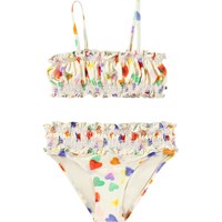 Dehnbarer Bikini in Weiß mit bunten Herzen für aktive Kinder mit UV-Schutz 50+. Das Bikini-Oberteil ist weit geschnitten mit einem gerafften Effekt und dünnen Trägern, und es ist komplett gefüttert. Die Hose hat einen elastischen Bund mit einem gerafften Effekt, eine reguläre Passform und ist ebenfalls komplett gefüttert. Das Produkt ist CE-gekennzeichnet und gemäß der Norm EN-13758-1 getestet.