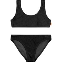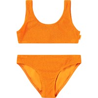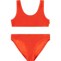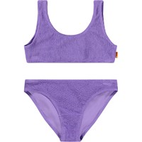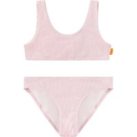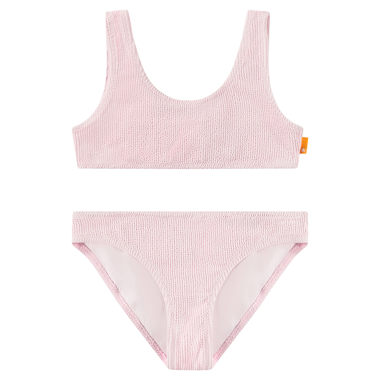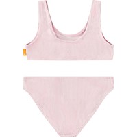Dehnbarer rosa Bikini mit strukturiertem Muster und UV-Schutz 50+. Der Bikini hat ein breites Oberteil, breite Träger, einen tiefen Rückenausschnitt und ist komplett gefüttert. Die Hose hat einen elastischen Bund, eine reguläre Passform und ist ebenfalls komplett gefüttert. Das Produkt ist CE-gekennzeichnet und gemäß der Norm EN-13758-1 getestet.