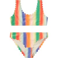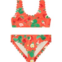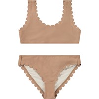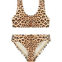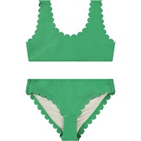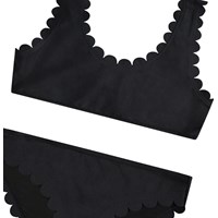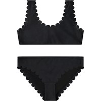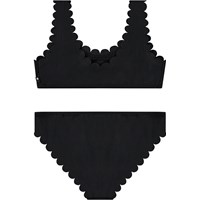 Schwarzer Bikini für aktive Kinder, hergestellt aus recyceltem Polyester mit UV-Schutz 50+. Der Badeanzug hat ein breites Oberteil mit breiten Trägern, tiefem Rücken und weichen, welligen Kanten am Hals und an den Ärmeln. Die Hose hat einen elastischen Bund, weiche, wellige Kanten an den Beinen, eine reguläre Passform und ist komplett gefüttert. Das Produkt ist CE-gekennzeichnet und gemäß der Norm EN-13758-1 getestet.
