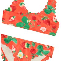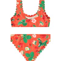 Bikini für aktive Kinder aus recyceltem Polyester mit UV-Schutz von 50+. Der Bikini hat ein breites Oberteil, breite Träger, einen tiefen Rücken und einen weichen, welligen Rand am Hals und an den Ärmeln. Die Hose hat einen elastischen Bund, weiche, wellige Kanten an den Beinen, eine reguläre Passform und ist komplett gefüttert. Der Bikini ist rot mit einem Allover-Druck von Erdbeer-Pflanzen. Das Produkt ist CE-gekennzeichnet und gemäß der Norm EN-13758-1 getestet.
