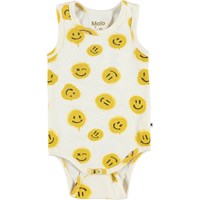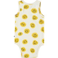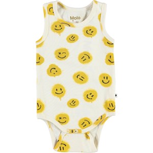 Faros ist ein weißer, ärmelloser Babybody mit kleinen gelben, aufgesprühten Smileys. Faros hat im Kragen und zwischen den Beinen einen Druckknopf, der das An- und Ausziehen des Bodys erleichtert.
