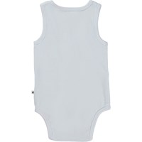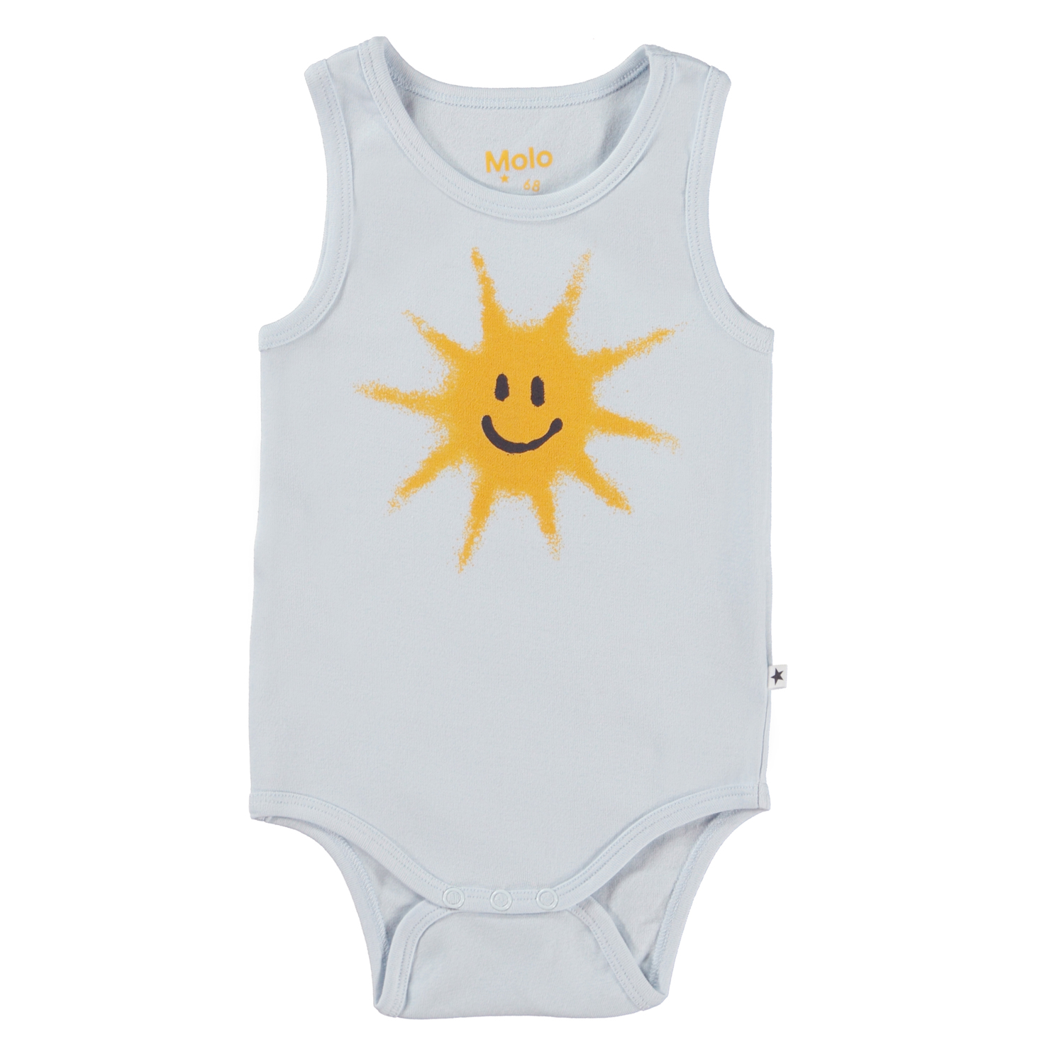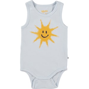 Fabulous ist ein hellblauer, ärmelloser Babybody in Wollweiß mit einem Aufdruck einer fröhlichen Sonne auf der Vorderseite. Druckknöpfe zwischen den Beinen erleichtern das An- und Ausziehen des Bodys.