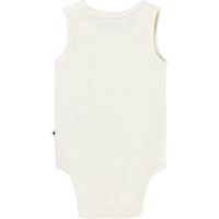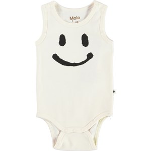 Faros ist ein weißer, ärmelloser Babybody mit dem Aufdruck eines großen schwarzen, gesprühten Smileys. Faros hat im Kragen und zwischen den Beinen einen Druckknopf, der das An- und Ausziehen des Bodys erleichtert.