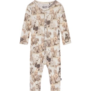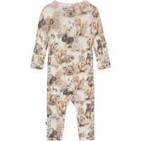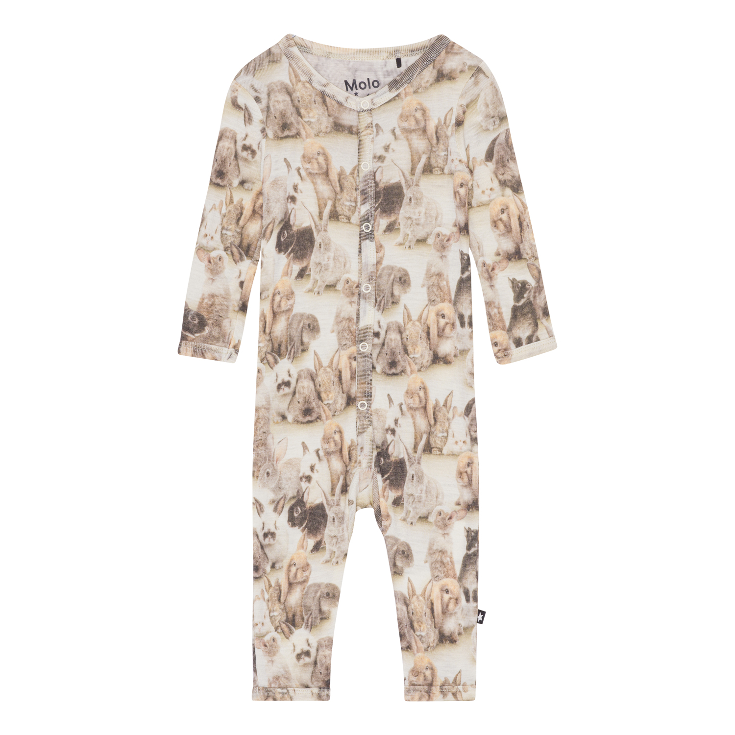 Babyanzug im Allover-Print in Brauntönen. Der Druck zeigt die süßesten, weichsten kleinen Kaninchen, die sehr eng beieinander sitzen. Dieser Body besteht aus 100% Merinowolle, hat lange Ärmel, lange Beine und Druckknöpfe vorne.