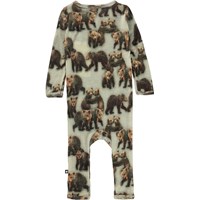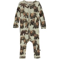 Fahari ist ein grauer Babyanzug mit einem Aufdruck von Braunbären. Der Anzug ist aus 100% Merino Wolle und hat lange Beine und Ärmel sowie einen V-Ausschnitt und Druckknöpfe entlang der Vorderseite.
