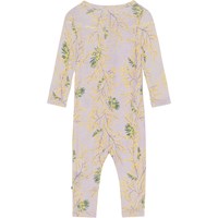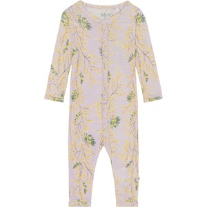 Helllila Babyanzug mit Allover-Print. Der Druck zeigt feinste gelbe Mimosenblütenreihen. Dieser Anzug besteht aus 100% Merinowolle, hat lange Ärmel, lange Beine und Druckknöpfe auf der Vorderseite.