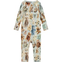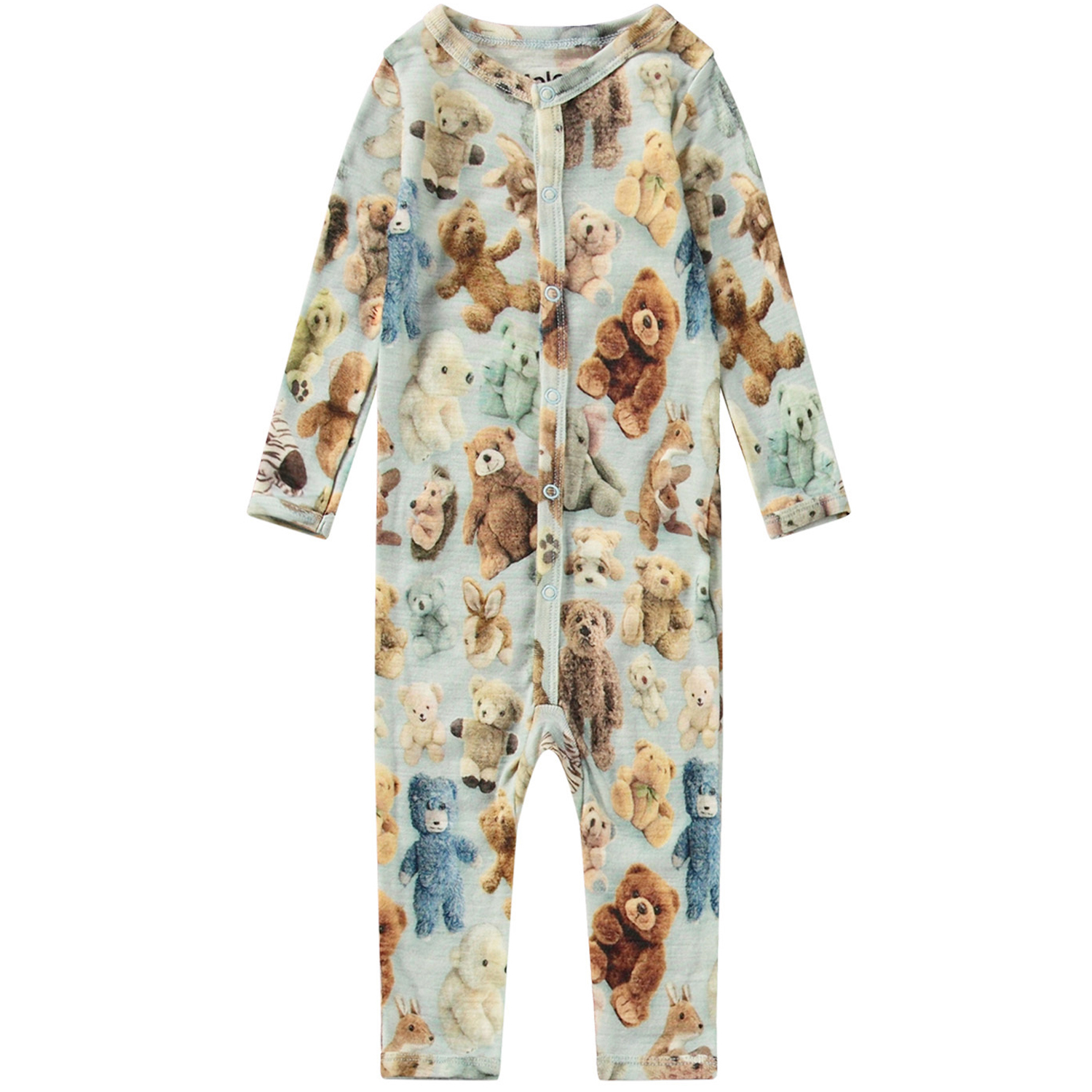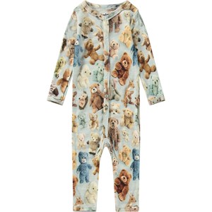 Mehrfarbiger Overall aus Öko-Merinowolle mit langen Ärmeln, langen Beinen und Knöpfen auf der Vorderseite. Der Overall hat ein Allover-Muster mit kuschelnden und feiernden Teddybären.