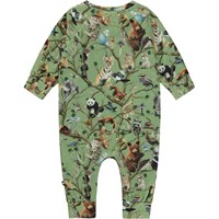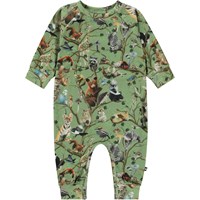 Grüner Babyanzug mit Raglanärmeln und Allover-Print. Der Druck zeigt alle Arten von Tieren im Baum des Lebens. Sie erzählen die Geschichte, wie wir alle auf der Welt miteinander verbunden sind. Wie die Wurzeln von Bäumen sind Pilze und Vögel, Bäume und Bären, groß und klein, miteinander verbunden sind, und dass wir uns alle umeinander kümmern mussen. Dieser Babyanzug besteht aus 100% Baumwolle, hat lange Ärmel, lange Beine und Druckknöpfe sowohl am Hals als auch zwischen den Beinen, wodurch der Anzug leicht an- und ausgezogen werden kann.