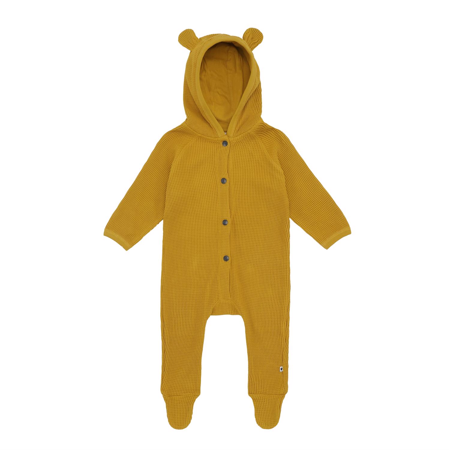 Faith ist ein gelber Babyanzug mit einem Knopfverschluss vorne sowie einer Kapuze mit kleinen aufgenähten Ohren. Beachte Sie dass der Anzug von Größe 56-74 Füße hat, und ohne von Größe 80-92.