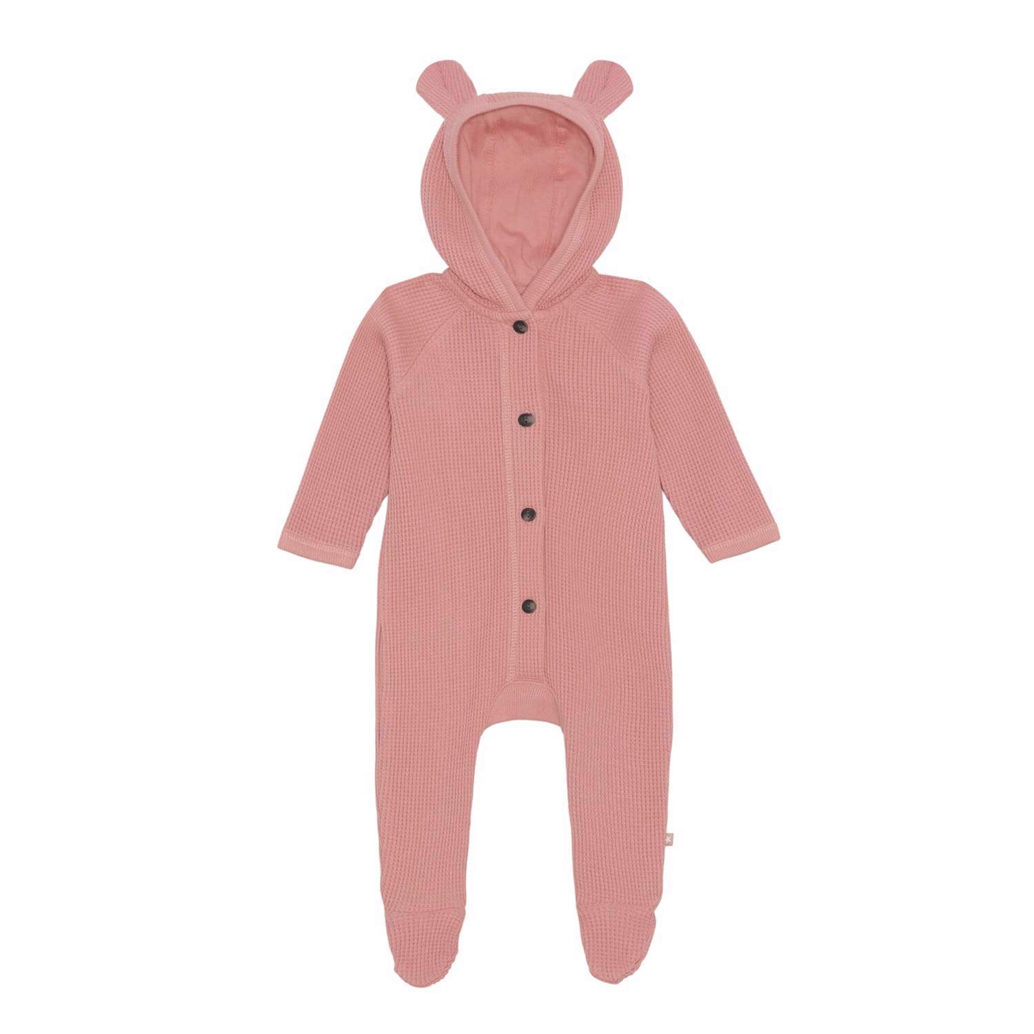 Faith ist ein pinker Babyanzug aus Waffelmuster mit Knopfverschluss vorne, sowie einer Kapuze mit kleinen angenähten Ohren. Beachten Sie, dass der Anzug in den Größen 56-74 Füße hat, während der Anzug in den Größen 80-92 ohne Füße ist.