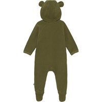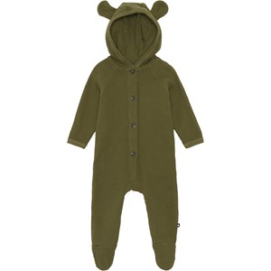 Faith ist ein grüner waffelgewebter Babyanzug mit Knopfverschluss auf der Vorderseite sowie einer Kapuze mit kleinen angenähten Ohren. Beachten Sie, dass der Anzug in den Größen 56-74 Füße hat, während der Anzug in den Größen 80-92 ohne ist.