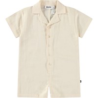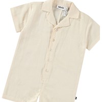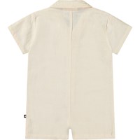 Beiger Leinenoverall für die Kleinen. Der Overall hat kurze Ärmel, kurze Beine, einen schönen Kragen und eine lockere Passform.