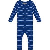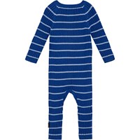 Dunkelblauer Overall aus weichem Baumwoll-/Wollripp mit hellblauen Streifen und Raglanärmeln. Der Overall hat einen Rundhalsausschnitt, lange Beine und Ärmel sowie eine Knopfleiste vorne.
