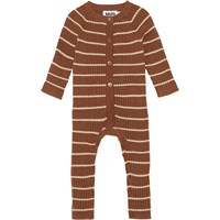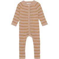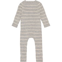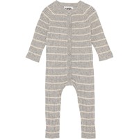 Farley ist ein gestrickter grauer Babyanzug mit beigen Streifen. Der Anzug besteht aus 80 % Baumwolle und 20 % Wolle und hat lange Ärmel und Beine sowie Knöpfe auf der Vorderseite.