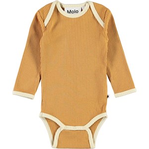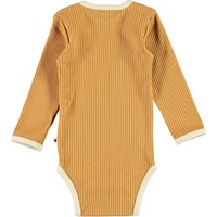 Faros ist ein honigfarbener langärmeliger Baby-Body in Ripp mit hellen Kantebändern. Druckknöpfe zwischen den Beinen, macht das an- und ausziehen einfach.
