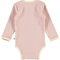 Faros ist ein rosa langärmeliger Baby-Body in Ripp mit weißen Kantenbändern. Druckknöpfe zwischen den Beinen, macht das an- und ausziehen einfach.