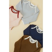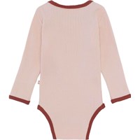 Faros ist ein hellgelber langärmeliger Babybody in Rippstrick mit pinkfarbenem Kantenband. Faros hat im Kragen und zwischen den Beinen einen Druckknopf, der das An- und Ausziehen des Bodys erleichtert. Kombinieren Sie mit passenden Hosen.