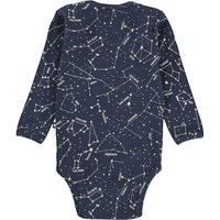 Faros ist ein blauer Babybody mit einem Aufdruck der Sternenkarte. Kombinieren Sie es mit einer passenden Hose. Faros hat einen Druckknopf zwischen den Beinen, der das An- und Ausziehen des Bodys erleichtert.