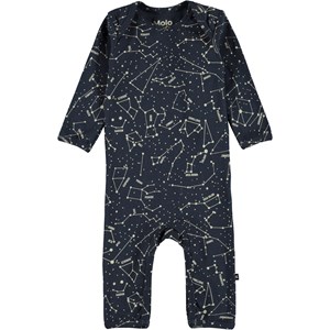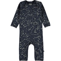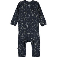 Faso ist ein blauer Babyanzug mit einem Aufdruck der Sternenkarte. Der Anzug hat lange Beine und Ärmel sowie Reißverschlüsse an Hals und Beinen, die das An- und Ausziehen des Anzugs erleichtern.