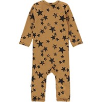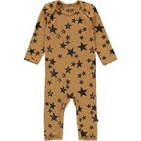 Faso ist ein brauner Babyanzug mit Sternenaufdruck. Der Anzug hat lange Beine und Ärmel sowie Reißverschlüsse an Hals und Beinen, die das An- und Ausziehen des Anzugs erleichtern.