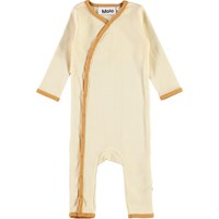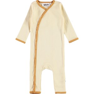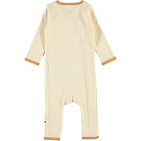 Fellow ist ein beiger Babyanzug mit langen Ärmeln und Beinen, sowie honigfarbenen Kantenbändern. Der Anzug hat einen feinen V-Halsausschnitt, der sich mit Knopfverschlüssen aus Druckknöpfen auf der einen Seite des Anzugs fortsetzt.