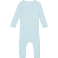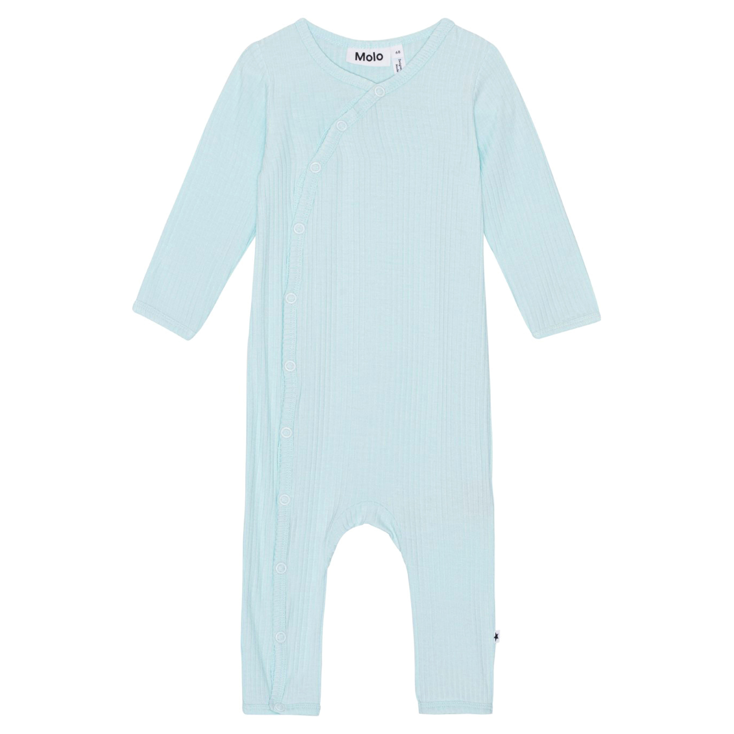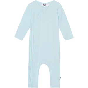 Hellblauer Babyanzug aus weicher gerippter Viskose. Der Anzug verfügt über einen Knopfverschluss mit Druckknöpfen an einer Seite des Körpers, was das An- und Ausziehen erleichtert. Der Anzug ist eng anliegend, hat einen V-Ausschnitt und lange Ärmel und Beine.