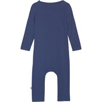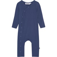Dunkelblauer Babyanzug aus Rippjersey. Dieser Baby-Body aus geripptem Viskose-Jersey hat lange Ärmel, lange Beine und einen Druckknopfverschluss, der ganz nach unten geht, was das An- und Ausziehen des Anzugs erleichtert.