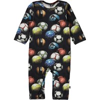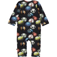 Fenez ist ein Babyanzug mit langen Beinen und Ärmeln und einem Aufdruck von bunten Fußbällen. Druckknöpfe an Hals und Beinen erleichtern das An- und Ausziehen des Anzugs.