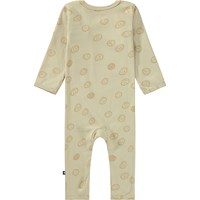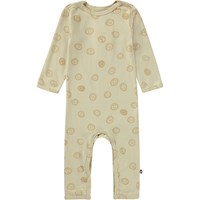 Beigefarbener Babyanzug mit Allover-Print. Der Druck zeigt viele kleine lächelnde Gesichter und Peace-Zeichen. Dieser Babyanzug besteht aus 100% Baumwolle, hat lange Ärmel, lange Beine und Druckknöpfe sowohl am Hals als auch zwischen den Beinen, wodurch der Anzug leicht an- und ausgezogen werden kann.