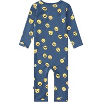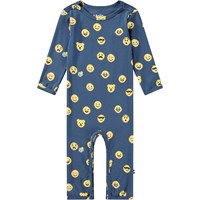 Dunkelblauer Overall aus Öko-Baumwolle für die Kleinen. Der Overall hat lange Ärmel und Beine sowie Druckknöpfe auf einer Schulter und zwischen den Beinen, was das An- und Ausziehen erleichtert. Er ist eng anliegend und hat einen niedlichen gelben Pixel-Emoji-Allover-Print.