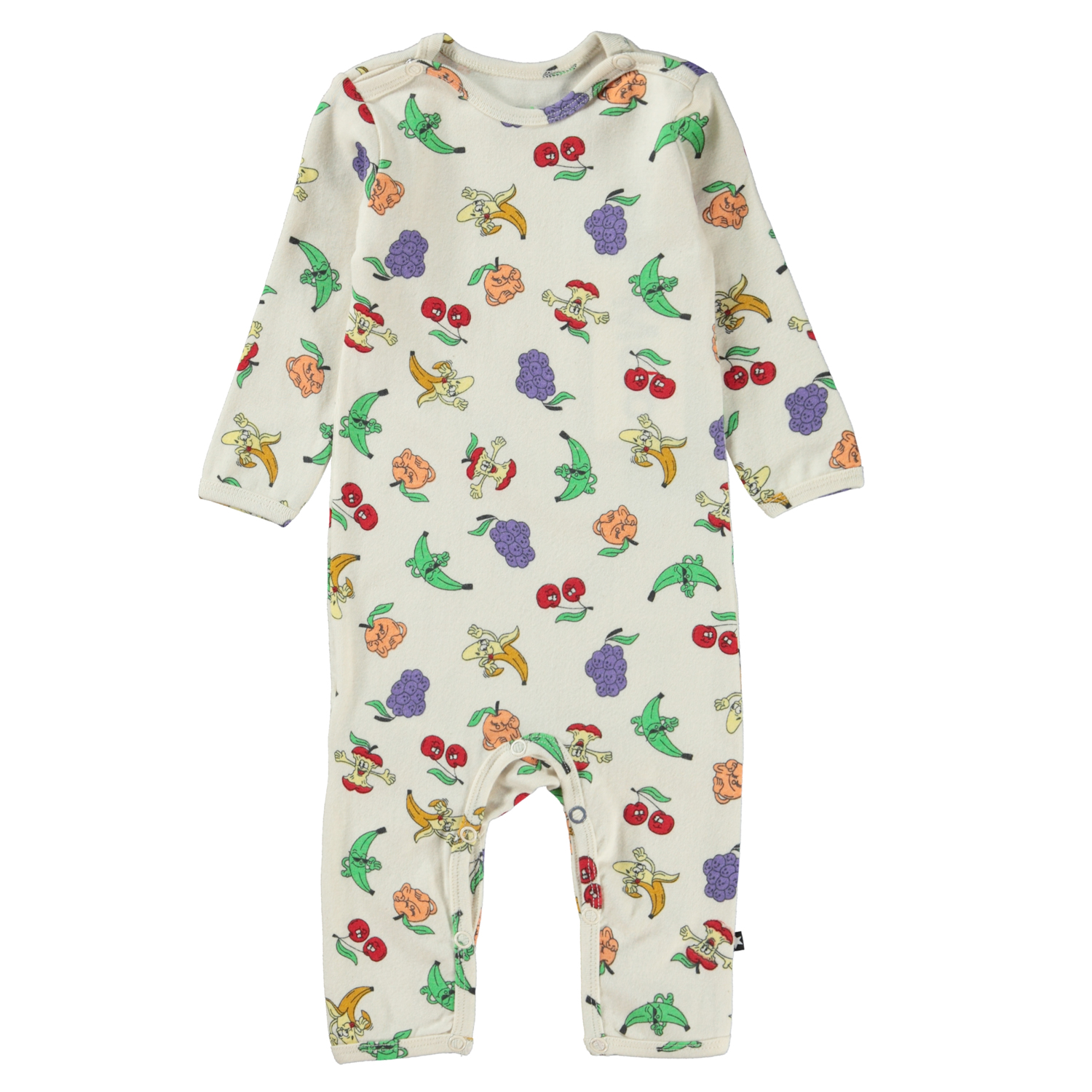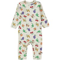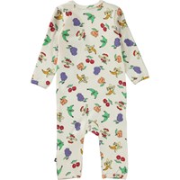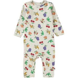 Fenez ist ein Babyanzug mit langen Beinen und Ärmeln. Der Anzug ist weiß mit einem witzigen Aufdruck verschiedener Früchte. Druckknöpfe an der Schulter und zwischen den Beinen erleichtern das An- und Ausziehen des Bodys.