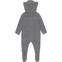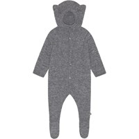 Grau melierter Babyanzug mit Kapuze. Dieser Anzug ist aus einer schönen Alpaka-Wollmischung gefertigt, die ihn perfekt für die kalten Tage macht. Der Babyanzug hat lange Arme und lange Beine, einen Knopfverschluss auf der Vorderseite und die Kapuze hat kleine runde Ohren. Der Anzug hat Füße in Größe 54 bis Größe 74.