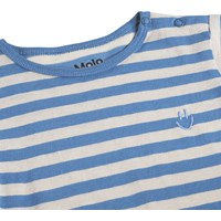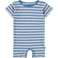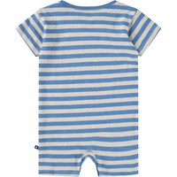 Kurzärmeliger Strampler für die Kleinen aus weicher, biologischer Baumwolle mit blauen Streifen. Der Strampler hat kurze Beine, Druckknöpfe an der Schulter und zwischen den Beinen sowie eine lockere, bequeme Passform.