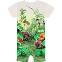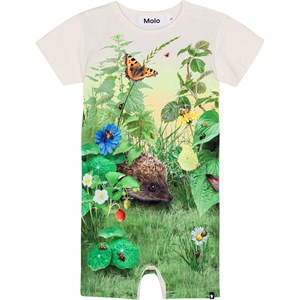 Cremeweißer Overall mit T-Shirt-Ärmeln aus Öko-Baumwolle. Der Anzug verfügt über Druckknöpfe an der Schulter und zwischen den Beinen, die das An- und Ausziehen erleichtern. Der Anzug hat eine lockere Passform mit viel Bewegungsfreiheit. Der Anzug hat einen Aufdruck auf der Vorderseite, der einen niedlichen kleinen Igel, Insekten und Schmetterlinge im grünen Gras zeigt.