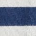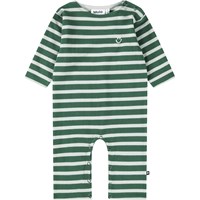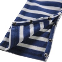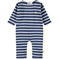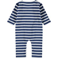 Baby-Strampler aus Öko-Baumwolle mit breiten blauen Bretagne-Streifen und einem weiß bestickten lächelnden Gesicht auf der Brust. Der Baby-Strampler hat lange Ärmel und Beine sowie Druckknöpfe an der Schulter und zwischen den Beinen, um das An- und Ausziehen zu erleichtern.