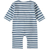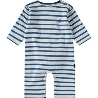 Öko-Baumwoll-Overall für die Kleinen. Der Overall hat lange Ärmel und Beine, mit Knopfverschluss an der Schulter und zwischen den Beinen, was das An- und Ausziehen erleichtert. Der Overall ist in gestreiften Blautönen gehalten und hat ein gesticktes lächelndes Gesicht auf der Brust.