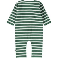 Baby-Strampler aus Öko-Baumwolle mit breiten grünen Bretonstreifen und einem weiß bestickten lächelnden Gesicht auf der Brust. Der Baby-Strampler hat lange Ärmel und Beine sowie Druckknöpfe an der Schulter und zwischen den Beinen, um das An- und Ausziehen zu erleichtern.