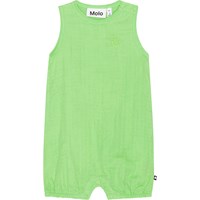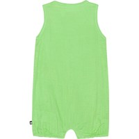 Hellgrüner Babyanzug aus Öko-Baumwolle. Der Anzug ist ärmel- und beinlos und eignet sich daher perfekt für heiße Sommertage. Druckknöpfe am Hals und zwischen den Beinen erleichtern das An- und Ausziehen des Anzugs, außerdem sorgen Gummizüge an den Beinen für gute Beweglichkeit. Der Anzug hat ein kleines lächelndes Gesicht, das in derselben Farbe auf die Brust gestickt ist.