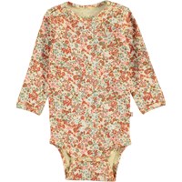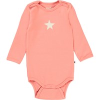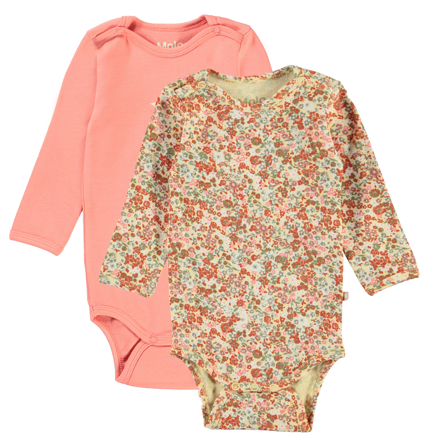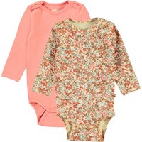 Foss ist ein langärmeliger Babybody. Hier erhalten Sie Foss im 2er-Pack, das sowohl einen korallenfarbenen mit weißem Stern als auch einen mehrfarbigen mit kleinen Blüten enthält. Druckknöpfe am Hals und zwischen den Beinen erleichtern das An- und Ausziehen des Bodys.