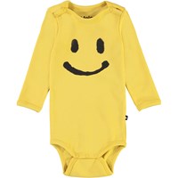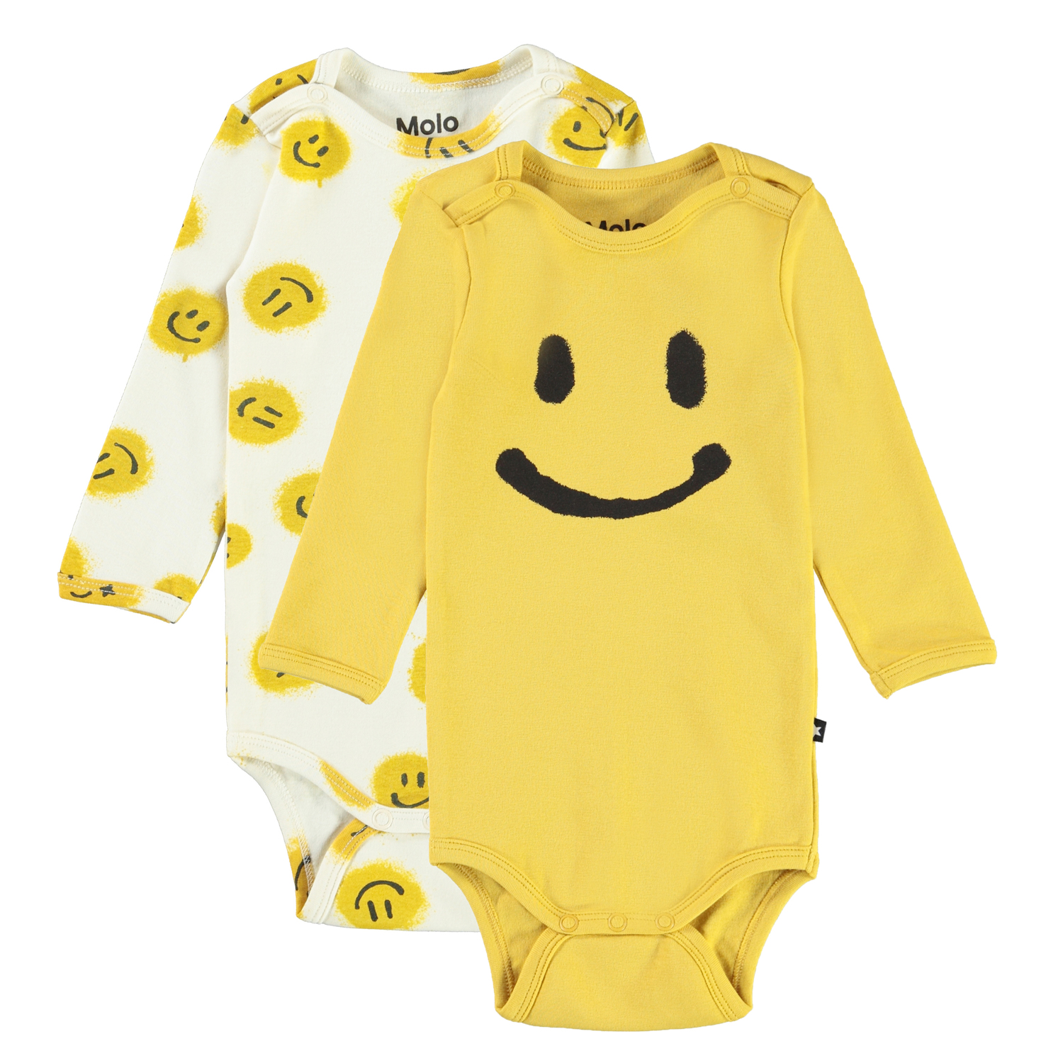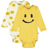 Foss ist ein langärmeliger Babybody. Hier erhalten Sie Foss im 2er Pack, das sowohl einen cremefarbenen mit gesprühten gelben Smileys als auch einen gelben mit einem großen schwarzen gesprühten Smiley enthält. Druckknöpfe am Hals und zwischen den Beinen erleichtern das An- und Ausziehen des Bodys.