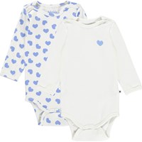 Foss ist ein langärmliger Babybody. Foss ist hier im 2er-Pack erhältlich, das sowohl einen weißen als auch einen mit hellblauen Herzen enthält. Druckknöpfe am Hals und zwischen den Beinen erleichtern das An- und Ausziehen des Bodys.