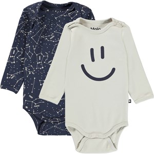 Foss ist ein langärmliger Babybody. Hier ist Foss in einem 2er-Pack erhältlich, das sowohl ein blaues mit einem Aufdruck von Sternenkarten als auch ein gebrochenes Weiß mit einem Aufdruck eines Smileys enthält. Druckknöpfe am Hals und zwischen den Beinen erleichtern das An- und Ausziehen des Bodys.