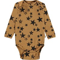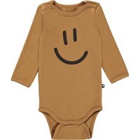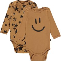 Foss ist ein langärmliger Babybody. Hier ist Foss im 2er-Pack erhältlich, das zwei braune Bodys enthält, einer mit Sternen-Print und der andere mit Smiley-Print. Druckknöpfe am Hals und zwischen den Beinen erleichtern das An- und Ausziehen des Bodys.
