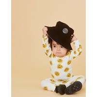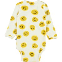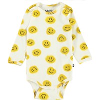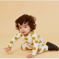 Foss ist ein langärmliger cremefarbener Babybody mit gelben aufgedruckten Smileys. Druckknöpfe am Hals und zwischen den Beinen erleichtern das An- und Ausziehen des Bodys. Kombinieren Sie mit passenden Hosen.