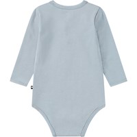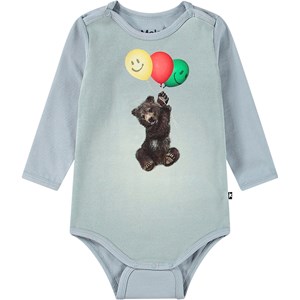 Blauer Langarm-Body aus Öko-Baumwolle. Der Body hat Druckknöpfe am Kragen und zwischen den Beinen, was das An- und Ausziehen erleichtert. Er hat einen niedlichen Aufdruck eines kleinen Bärenjungen, der Luftballons hält.
