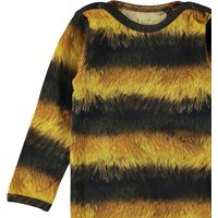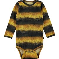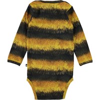 Foss ist ein langärmeliger Babybody mit einem gestreiften Druck in Gelb und Schwarz, der wie eine Biene aussieht. Druckknöpfe am Hals und zwischen den Beinen erleichtern das An- und Ausziehen.