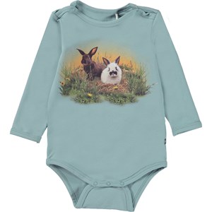 Blauer Babybody mit Frontprint. Der Druck zeigt zwei niedliche kleine Kaninchen, die gerade aus ihrem Kaninchenbau gekommen sind und auf der grünen Wiese mit wilden Blumen liegen. Dieser Body besteht aus 100% Baumwolle, hat lange Ärmel und Druckknöpfe am Kragen und zwischen den Beinen, die das An- und Ausziehen des Bodys erleichtern. Kombinieren Sie evt. diesen Body mit der Hose Sammy in der Farbe "Calm".
