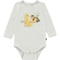 Foss ist ein weißer Babybody mit einem Aufdruck von niedlichen kleinen Entchen auf der Vorderseite. Foss hat Druckknöpfe im Kragen und zwischen den Beinen, die das An- und Ausziehen des Bodys erleichtern.