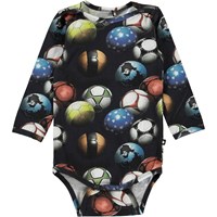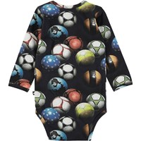 Foss ist ein Unisex-Babybody mit einem Aufdruck aus bunten Fußbällen. Foss hat einen Druckknopf im Kragen und zwischen den Beinen, der das An- und Ausziehen des Bodys erleichtert.