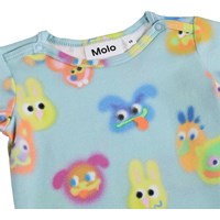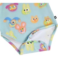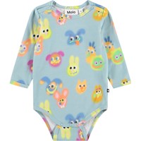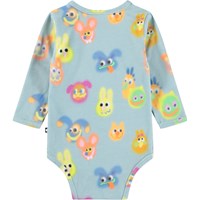 Blauer, langärmeliger Body für die Kleinen aus Bio-Baumwolle mit einem lustigen Print. Der Body hat Einfassungen und Druckknöpfe an den Schultern und zwischen den Beinen für einfaches An- und Ausziehen.